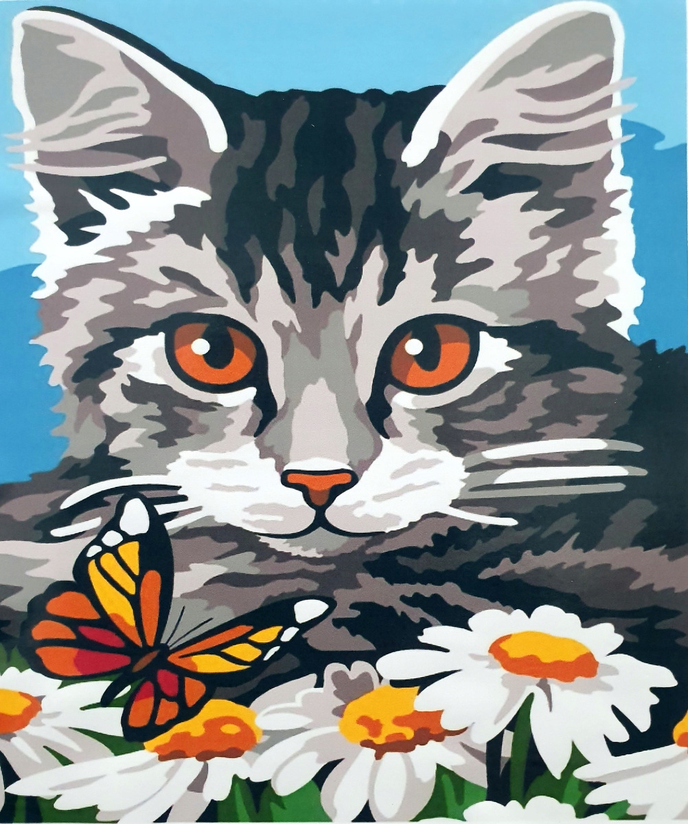 Malowanie po numerach kot burasek ze stokrotkami i motylkiem