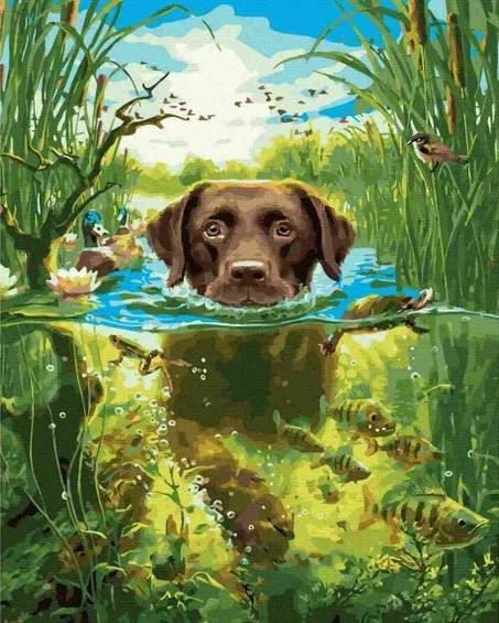 Malowanie po numerach - Pies w rzece 40x50cm