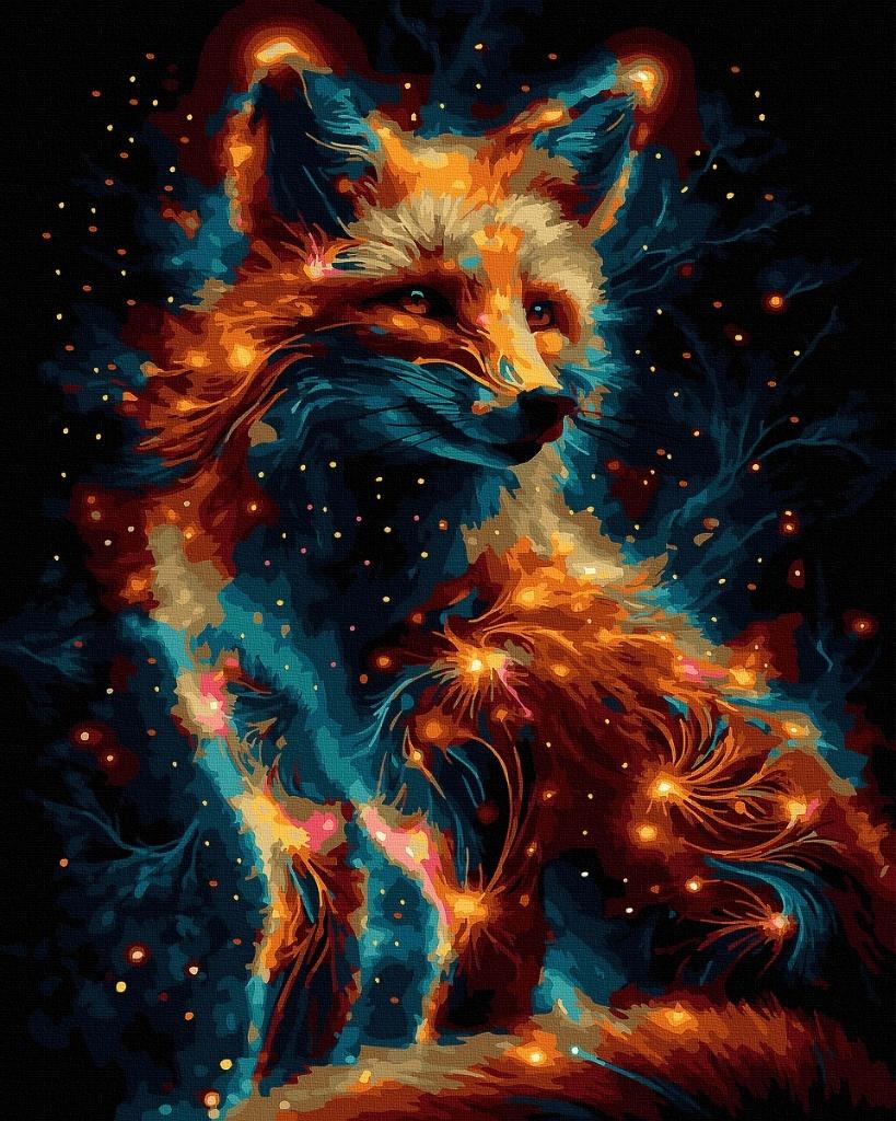 Magiczny lis stworzony z kolorów galaktyki i światła gwiazd. Idealny dla fanów fantasy i niesamowitych, kolorowych ilustracji.