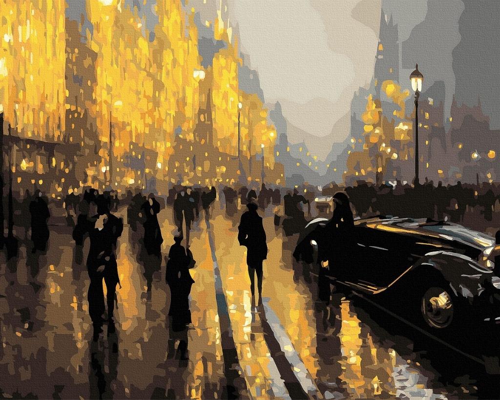 Nocna scena miejskiego życia z odbiciami świateł w mokrym bruku. Elegancki obraz o miejskim klimacie z nutą nostalgii.