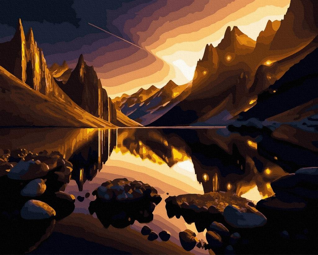 Majestatyczne góry odbijające się w jeziorze, rozświetlone promieniami zachodzącego słońca. Pejzaż, który wypełni Twój dom spokojem i naturalnym pięknem.
