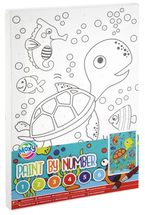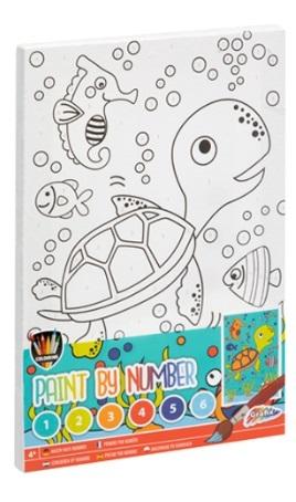 Malowanie po numerach, wzór Żółwik.  Obrazek o wymiarach 30 x 20 cm. Wzór nadrukowany na płótnie,  zestawie 6 kolorów farbek i pędzelek. Obrazki na płótnie do samodzielnego pomalowania, stanowią wspaniała  rozrywkę dla dzieci od najmłodszych lat.