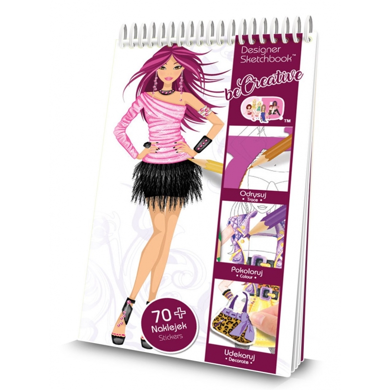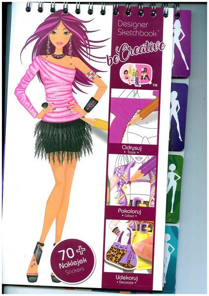 Zawiera szkice, 4 stylizacje fryzur, szablon, zestaw naklejek.