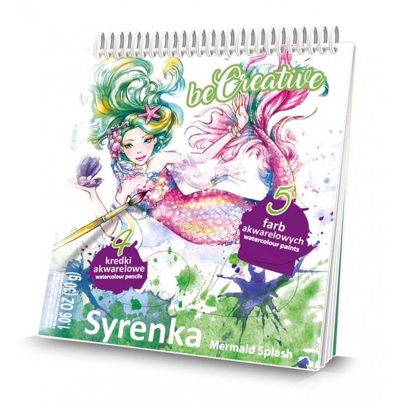 Zestaw zawiera szkicownik, zestaw naklejek 105 szt, farby akwarelowe, pędzelek i kredki akwarelowe,