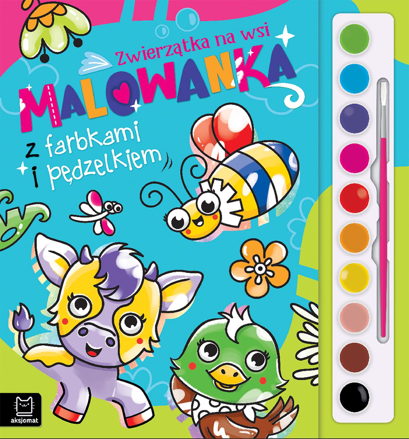Piękne obrazki, pędzelek i zestaw farbek to propozycja dla małych artystów. Zapraszamy na spotkanie z mieszkańcami wsi - poznaj każdego z nich z osobna. Są tu: świnka, szybki kucyk Karino, kogut Czester, owieczka Beza, indyczka Izaura, króliczek Flopcio, kurka Hilda, myszka Śmieszka, krówka Blenda, żabki Alma i Wera, ślimak Lucjan, Biedronka Fionka i mały ptaszek. Który zwierzak chce się bawić w chowanego? Który złości się i rozkłada ogon? Czy Śmieszka znajdzie krecika Dyzia? Lubiana przez dzieci tematyka rysunków i ciekawe historyjki o zwierzętach zachęcą dzieci do kolorowania. Malowanki ze zwierzakami to świetna zabawa kolorami, która rozwinie kreatywność i sprawność manualną dziecka. Pozwoli również ćwiczyć cierpliwość i koncentrację. Dołączony do książeczki zestaw 10 kolorów farbek i pędzelek pozwalają dziecku rozpocząć zabawę gdzie i kiedy chce - wystarczy tylko odrobina wody. Baw się kolorami razem ze zwierzętami! Malowanka z farbkami i pędzelkiem to strzał w dziesiątkę!