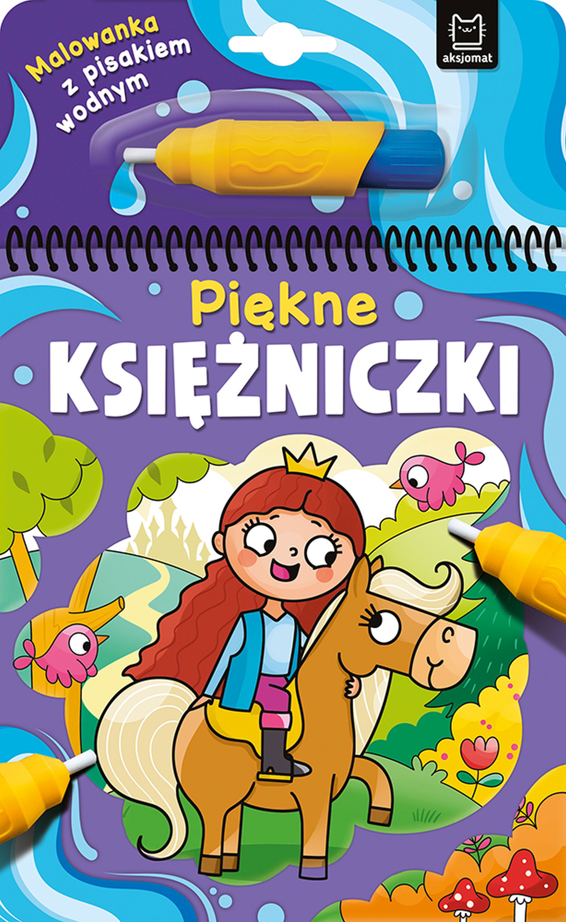 Maluj wodą! Kształty, kolory i obrazy pojawią się za każdym pociągnięciem pisaka. Dołączony do książki pisak wystarczy napełnić wodą i można już rozpocząć zabawę na zwilżonych mokrym pędzelkiem stronach pojawią się kolorowe ilustracje księżniczek. Znikną, kiedy strona wyschnie. Książką można bawić się wiele razy. Po zabawie należy wylać wodę z pisaka i schować go do opakowania. Dodatkową atrakcją są zamieszczone na kartach książeczki zabawne historyjki o księżniczkach i zagadki.