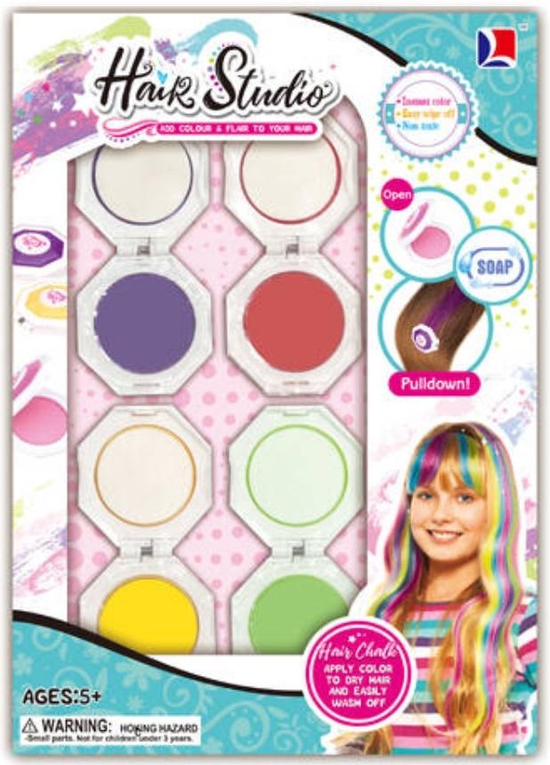 Malowidła do włosów. Zestaw zawiera: 4 zmywalne cienie do włosów. Kolory: zielony, żółty, różowy, fioletowy. Produkt nie potrzebuje baterii. Zabawka przeznaczona dla dzieci powyżej 5 roku życia.