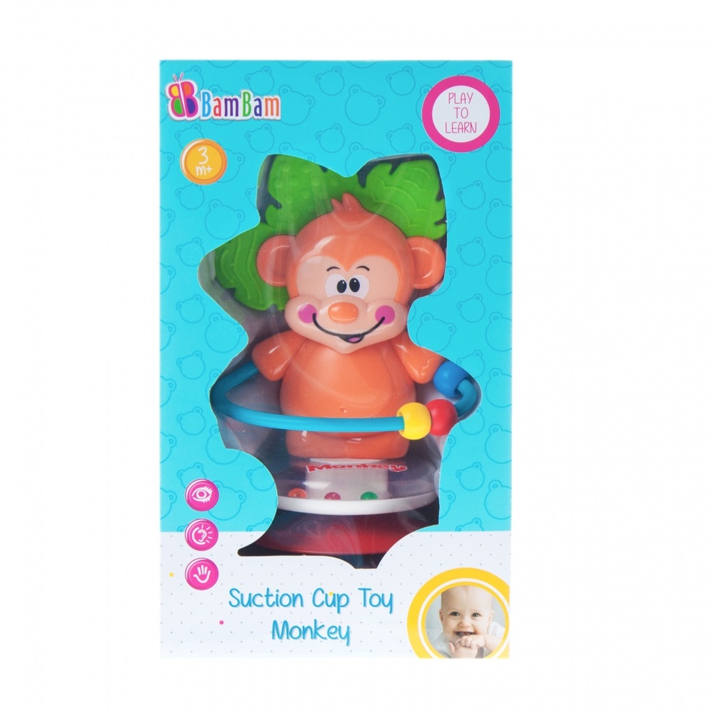 Grzechotka Małpka na Przyssawkę Bam Bam to zabawka edukacyjna z możliwością przytwierdzenia do stolika, tacki od wózka czy stolika do karmienia.