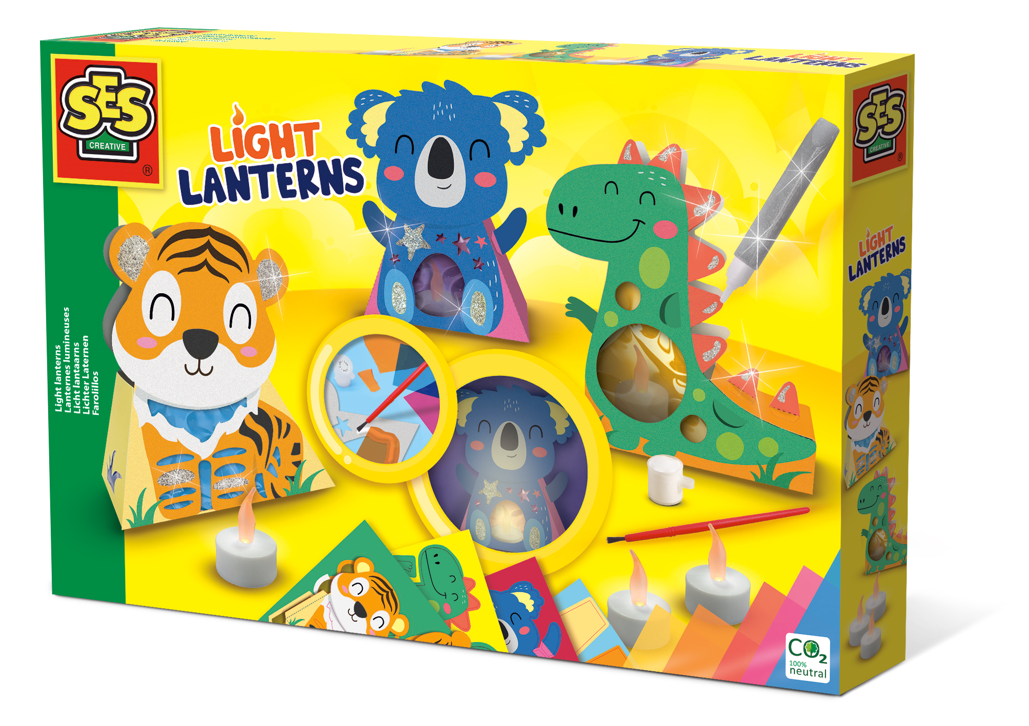Fajnie, z tym zestawem rzemieślniczym możesz stworzyć własne malutkie latarnie! Po prostu złóż zwierzątka i udekoruj je kolorową folią i brokatem. Zrobiłeś je? Umieść świecę LED w każdej lampie i odkryj, jak pięknie świecą lampiony. (Nie zawiera 3x CR2032)
