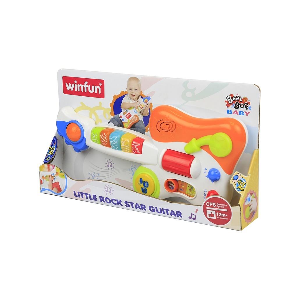 Zabawka działa jak proste pianinko - gryf gitary wyposażony jest w 5 kolorowych klawiszy, które po wciśnięciu uruchamiają melodie i mrugają wesoło światełkami. Zabawka oferuje 3 tryby zabawy oraz 3 możliwości wyboru tonacji melodii.