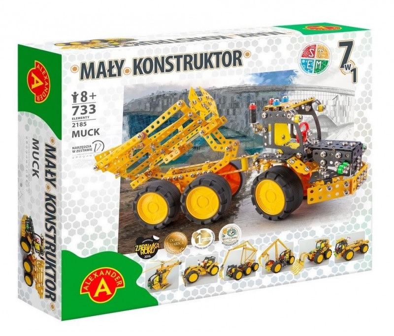 Mały Konstruktor to seria zabawek do samodzielnego montażu, rozwijająca zdolności manualne oraz wyobraźnię przestrzenną. Każdy model składa się z elementów metalowych o różnej wielkości i kształtach, a także jest wzbogacony kolorowymi elementami z tworzyw sztucznych. Dzięki dołączonemu zestawowi narzędzi, można zbudować wyjątkowy pojazd zgodnie ze wskazaniami instrukcji lub wedle własnej wyobraźni. Model po złożeniu jest trwały i może służyć do dalszej zabawy. To idealny wstęp do rozbudzenia w dziecku pasji inżyniera. Zabawka, która łączy pokolenia, zachęcając do wspólnego majsterkowania. Seria 7 w 1 gwarantuje jeszcze więcej zabawy. Sprawdź, jak z tych samych elementów zbudować całkowicie inne maszyny.
