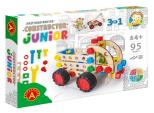 Mały Konstruktor Junior 3 in 1 TRUCK to ponadczasowa zabawka do samodzielnego montażu skierowana do dzieci w wieku od 4 lat. Zestaw składa się z drewnianych deseczek z dziurkami oraz kolorowych śrubek i łączników z tworzywa. Duże rozmiary elementów oraz uproszczona konstrukcja sprawiają, że dzieci już od najmłodszych lat mogą próbować sił w składaniu pierwszych pojazdów. Zabawka jest trwała i po złożeniu pojazd może służyć do dalszej zabawy. Zestaw wyposażony jest w narzędzia idealnie dopasowane do małych rączek, dzięki którym malec może wielokrotnie skręcać i rozkręcać konstrukcję. Z zawartych w opakowaniu elementów można zbudować aż trzy zupełnie różne pojazdy. Po skręceniu zabawki malec może przez jakiś czas bawić się nią, a kiedy znudzi mu się, może rozmontować wszystkie komponenty i zbudować zupełnie nowy model. Zabawka wspaniale wpływa na rozwój motoryki małej, rozwija cierpliwość oraz stymuluje wyobraźnię. Doskonale wspomaga naukę kolorów oraz liczenia. Wyjątkowa estetyka produktu i jakość wykonania umilają zabawę. Wszystkie komponenty wchodzące w skład produktu wytwarzane są w fabryce Alexandra.