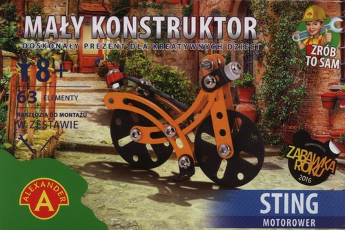"Mały Konstruktor" to zabawka do samodzielnego montażu. Każdy model składa się z różnej wielkości i kształtów elementów metalowych, a także jest wzbogacony kolorowymi elementami z tworzyw sztucznych. Zestaw wyposażony jest w narzędzia, którymi można skręcić i rozkręcić pojazd. Elementy zestawów można ze sobą łączyć tworząc własne konstrukcje. Zabawki z tej serii rozwijają zdolności manualne, wyobraźnię przestrzenną, umiejętności techniczne i cierpliwość oraz pomagają kształtować proces zapamiętywania. To idealna zabawka dla przyszłych inżynierów i nie tylko. 63 elementy Dla dzieci w wieku od 8 lat