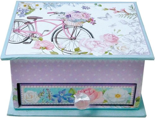 Wysokiej jakości pudełko na biżuterię, wzór z rowerem. Posiada odchylane wieczko z lusterkiem oraz jedną szufladkę. Wymiary:9,5 x 5,4 x 7,5 cm