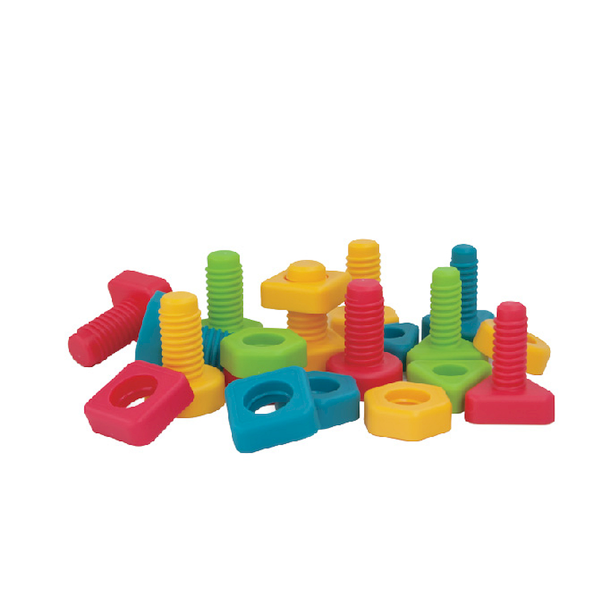 Dopasuj nakrętki do śrubek. Zadanie tylko pozornie wydaje są być proste. Te elementy są w 4 kolorach, 4 kształtach i mają 3 różne średnice.