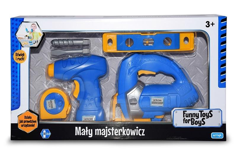 W zestawie: wkrętarka, wyrzynarka, miarka, poziomica, akcesoria, funkcje: dźwięk, światło.