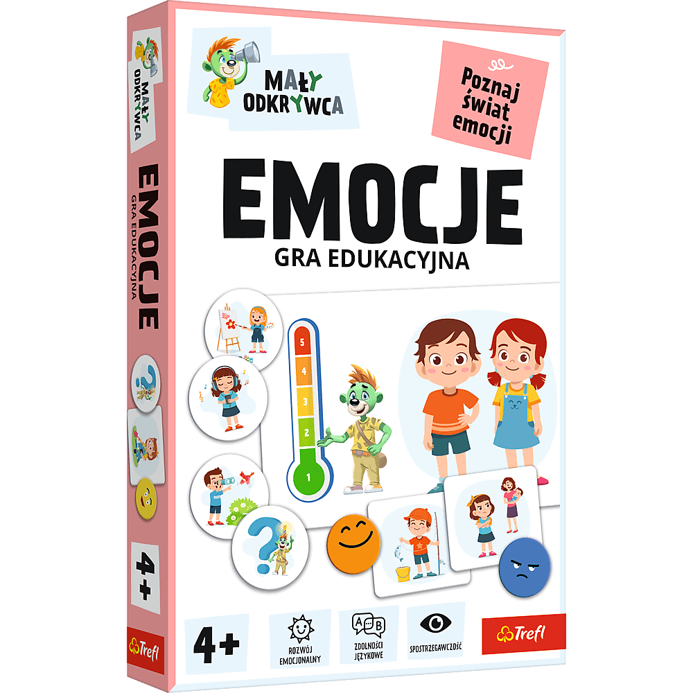 Emocje to edukacyjna układanka dla przedszkolaków, która w przyjazny sposób wprowadza dzieci w poznawania własnych uczuć. Dodatkowo uczą się rozpoznawać odczucia nie tylko swojego, ale też drugiej osoby. Kolorowe ilustracje to dobry wstęp do rozmowy o świecie dziecięcych emocji. Wiek graczy: 4+