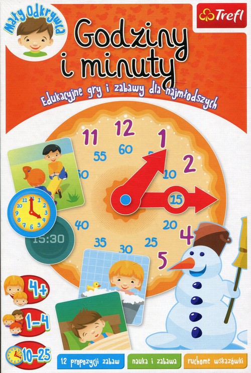 Godziny i minuty to wesoła zabawa, która pozwala dzieciom poznać działanie zegara oraz uczy przyporządkować różne czynności odpowiednim porom dnia i dniom tygodnia. Do gry dołączone są scenariusze i propozycje zabaw do wykorzystania przez rodziców. Zawartość: tarcza zegara z ruchomymi wskazówkami tor i żeton dni tygodnia tor i żeton pogody żetony z małymi zegarami do nauki godzin i minut 3 kartoniki pór dnia 21 kartoników aktywności instrukcja z propozycjami zabaw. Wiek 4+ Liczba graczy 1-4
