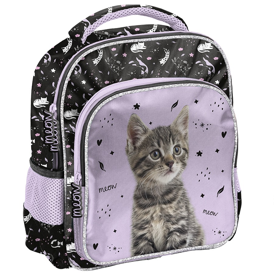 Mały plecak przedszkolny, dwie komory, boczne kieszonki z siatki (mieści małą butelkę, bidon lub termos).