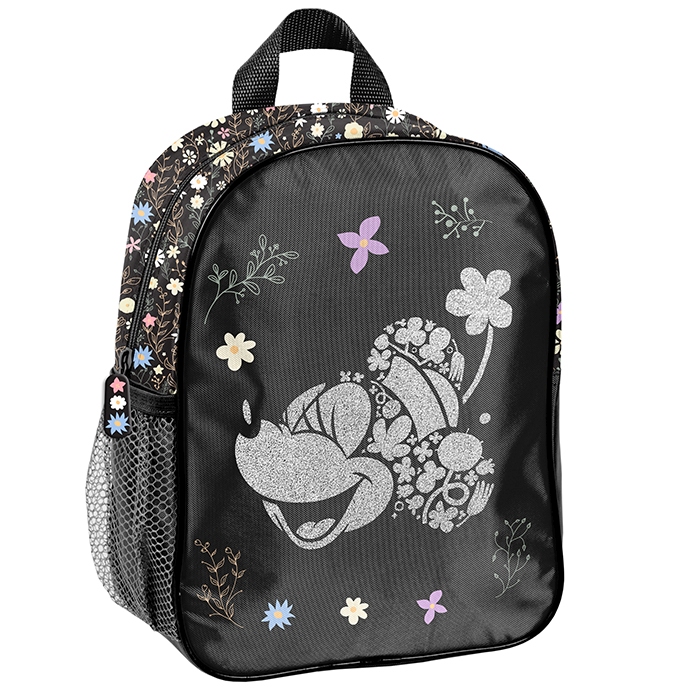 Mały plecak przedszkolny, jedna komora, jedna boczna kieszeń z siatki (mieści małą butelkę, bidon lub termos).