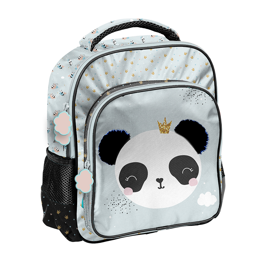 Plecak przedszkolny Panda. Idealny dla dzieci, które idą do przedszkola lub zerówki. Posiada jedną komorę oraz funkcjonalną kieszeń na froncie. Plecak ma lekko usztywnione plecy, uchwyt do przenoszenia oraz regulowane i wyściełane gąbką szelki. Dwie boczne kieszenie z siatki mieszczą bidon, małą butelkę lub termos.