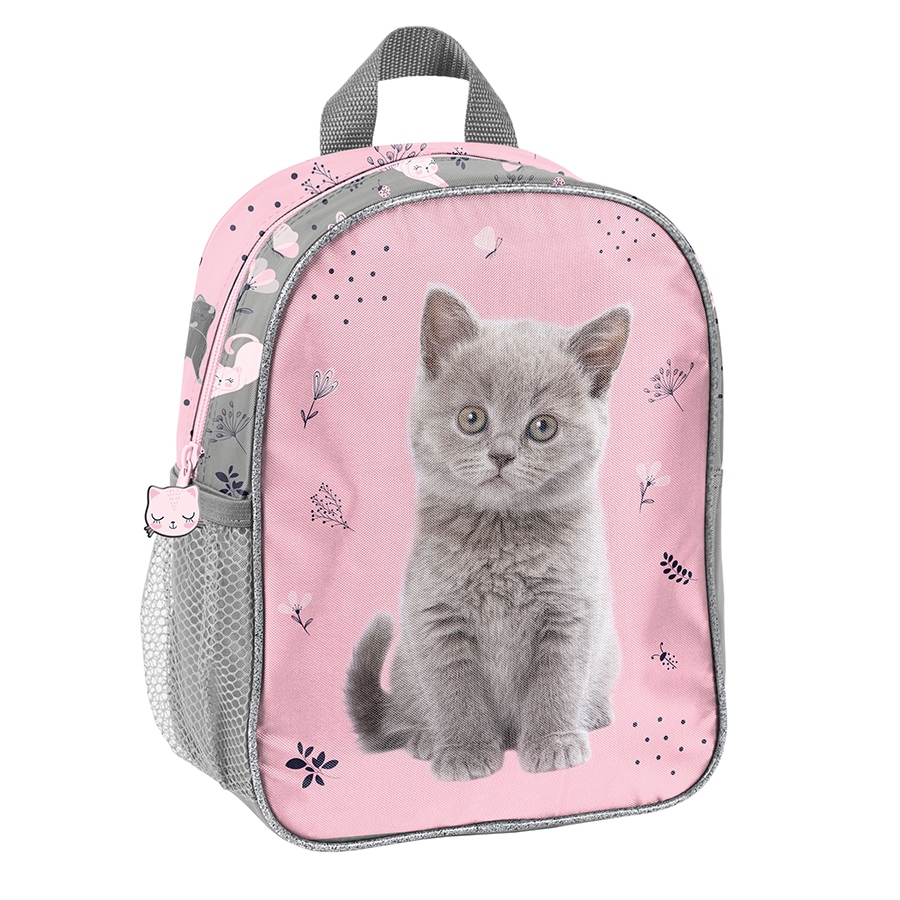 Mały plecak przedszkolny, jedna komora, jedna boczna kieszeń z siatki (mieści małą butelkę, bidon lub termos).