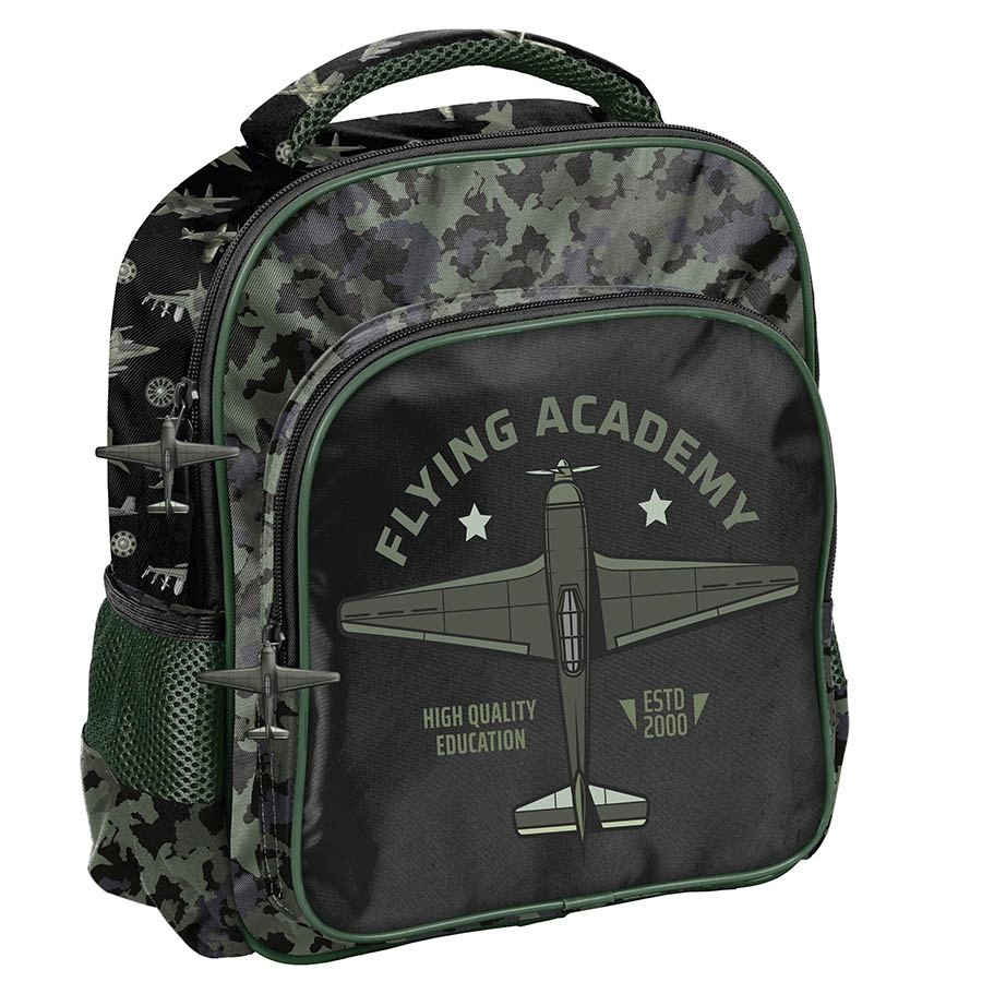 Mały plecak przedszkolny, dwie komory, boczne kieszonki z siatki (mieści małą butelkę, bidon lub termos).