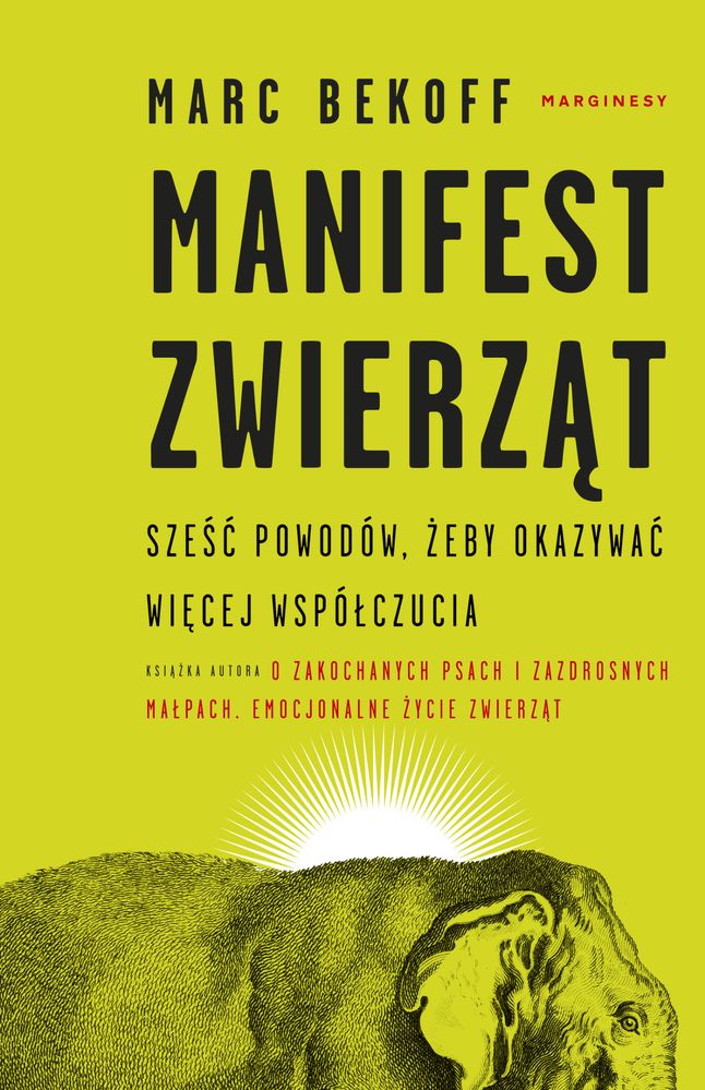 Dajcie się zainspirować. Nic tak nie poprawia humoru jak satysfakcja i radość, że zrobiło się coś dobrego. Że się komuś pomogło. Że dzięki nam wzrosła suma szczęścia. Nie trzeba wiele, żeby świat stał się bardziej przyjazny dla ludzi i zwierząt. I nie znaczy wcale, że należy rewolucjonizować swojego życie. Wystarczy odrobinę więcej współczucia. Ta książka daje siłę i pomoże stworzyć lepszy świat dla przyszłych pokoleń. A pierwszy krok bywa banalnie prosty. Marc Bekoff, światowej sławy etolog, mówi, że lepsze traktowanie zwierząt nie tylko dobrze wpływa na naszą planetę, ale i na nas samych. Pokazuje, że zwierzęta kochają, tęsknią i się złoszczą, że są zdolne do reakcji motywowanych współczuciem, okazują sobie życzliwość i empatię, że – zupełnie jak my – wyraźnie odróżniają dobro od zła. Manifest zwierząt powstał dla wszystkich – zwierząt i ludzi. Przedstawia sześć zasad, na których skorzysta każdy, bo humanitarne traktowanie zwierząt może przynieść obopólne korzyści. Siła tej książki polega na zachęcaniu do życzliwości zarówno człowieka wobec zwierząt, jak i wobec tych ludzi, którzy patrzą na świat nieco inaczej. Jedno jest pewne: im lepiej nauczymy się rozumieć zwierzęta, tym lepiej zrozumiemy samych siebie. A to sytuacja, w której nie ma przegranych.