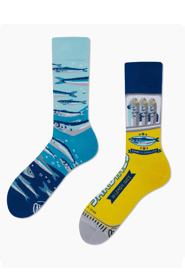 Zapuszkowane ryby na Twojej stopie? Czemu nie. Na drugie stopie jeszcze nie zapuszkowane sardynki. Takie właśnie są te nie do pary skarpetki. Idealne dla fanów sardynek w różnych zalewach.