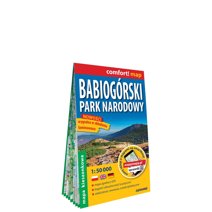 Laminowana, wygodna w składaniu kieszonkowa mapa turystyczna Babiogórskiego Parku Narodowego. Mapa