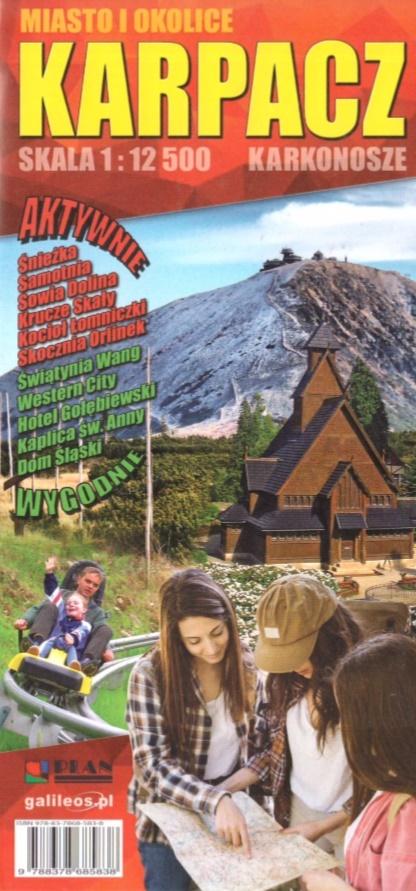 Aktualny plan Karpacza z najbliższą okolicą w bardzo dokładnej skali turystycznej. Mapa idealnie nadaje się dla wszystkich turystów, którzy podczas pobytu w Karpaczu chcą wędrować po najbliższej okolicy miasta z Karkonoszami włącznie. Dodatkowo na mapie zostały zaznaczone najważniejsze atrakcje turystyczne, które zostały podzielone na łatwo dostępne (Wygodnie) i takie, do których trzeba dotrzeć angażując większą ilość sił (Aktywnie). Na rewersie znajduje się opis każdej zaznaczonej atrakcji ze zdjęciem. Na rewersie znajduje się równie schemat szlaków pieszych w okolicy z czasami przejść. Mapa może być ciekawą pamiątką z regionu.