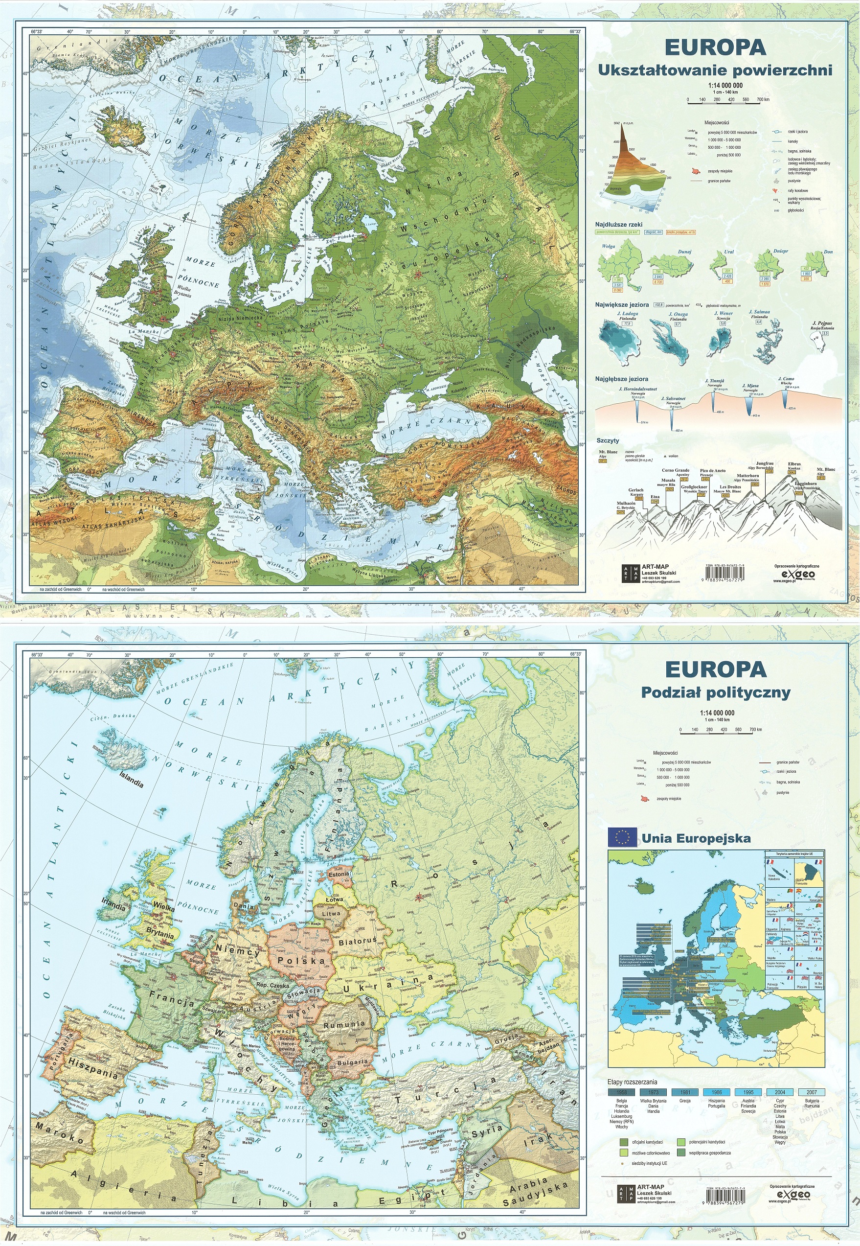 Dwustronna mapa ścienna Europy oprawiona w rurki PCV i sznuerk. Obustronnie laminowana, zawiera mapę Europy z podziałem politycznym oraz mapę ukształtowania terenu Europy. Można po niej pisać pisakiem suchościeralnym.
