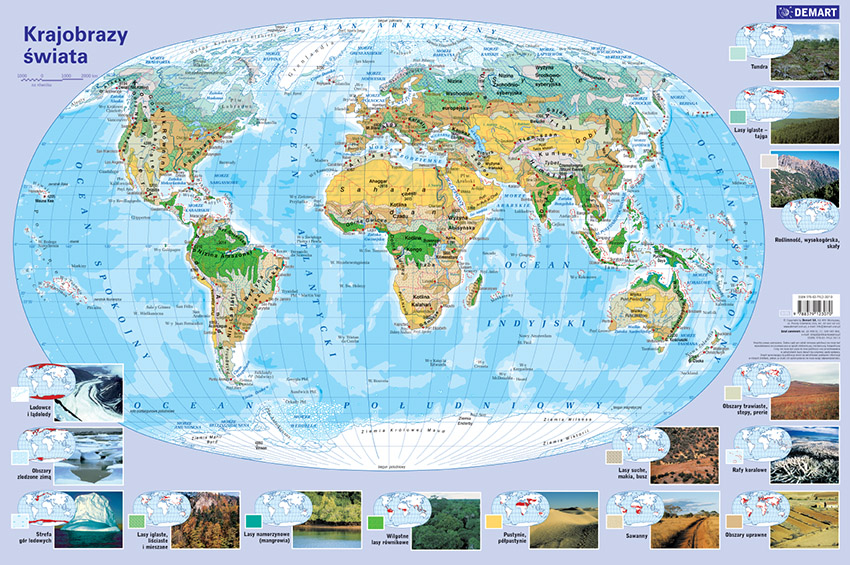 Mapa przedstawiająca krajobrazy świata wykonana w skali ok. 1 : 70 000 000 prezentuje najważniejsze zbiorowiska roślinne Ziemi wykazujące strefowość, czyli: wilgotne lasy równikowe, sawanny, pustynie gorące, stepy, lasy mieszane i liściaste, przeważnie iglastą tajgę, bezleśną tundrę, wreszcie lodowe pustynie Arktyki i Antarktyki. Są też formacje astrefowe związane z wysokimi górami i wielkimi rzekami. Wszystkie te – zdawałoby się skomplikowane wyróżnienia – są zilustrowane fotografiami i dodatkowymi mapami świata w niewielkiej skali, które ukazują zasięg danej formacji roślinnej. Już od piątej klasy szkoły podstawowej, uczniowie zapoznają się z tymi krajobrazami, a ta podkładka zdecydowanie pomoże im oswoić to zagadnienie. Użytkowe walory podkładki są jej kolejnym atutem: jest wykonana na gumowanej piance dobrze stabilizującej ją na biurku, na wierzchu pokrywa ją przezroczysta matowa folia – przyjemna w dotyku – po której nawet można pisać pisakiem i ścierać potem zapiski.