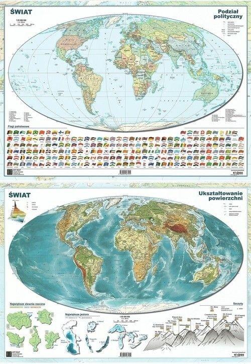 Obustronnie laminowana, zawiera mapę Świata z podziałem politycznym, oraz mapę ukształtowania terenu Świata.