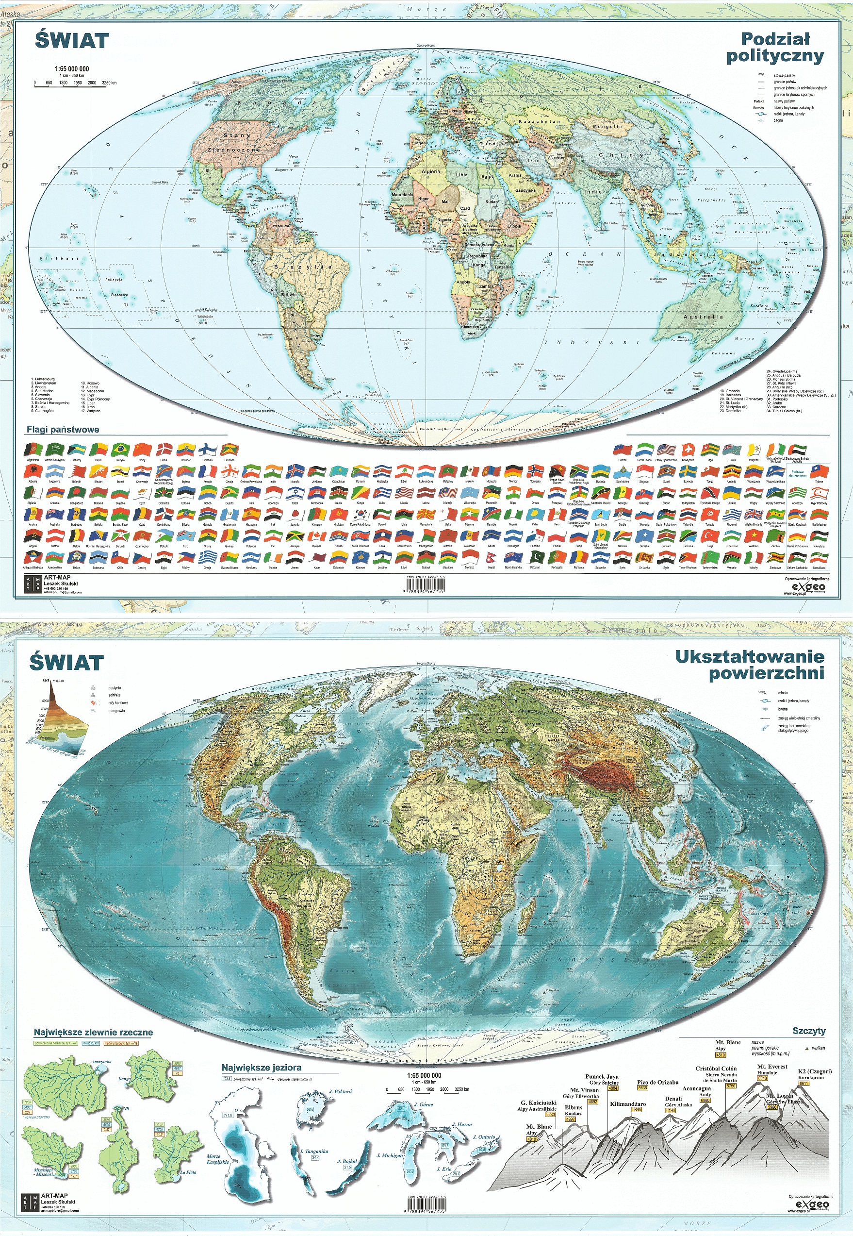 Dwustronna mapa ścienna Świata oprawiona w rurki PCV i sznuerk. Obustronnie laminowana, zawiera mapę Świata z podziałem politycznym oraz mapę ukształtowania terenu Świata. Można po niej pisać pisakiem suchościeralnym.