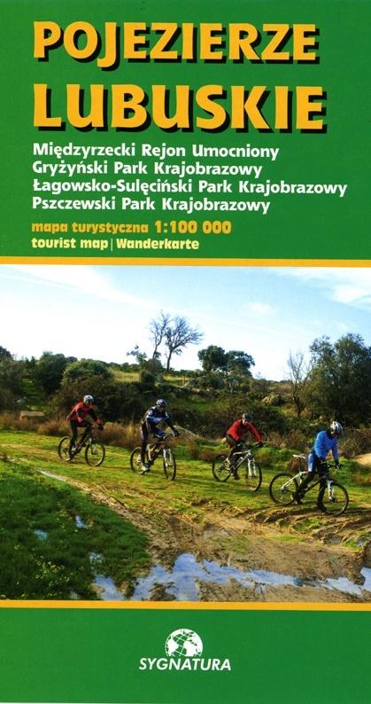Mapa turystyczna w skali 1:100 000 przedstawia całe Pojezierze Lubuskie. Na rewersie znajdują się propozycje ciekawych wycieczek rowerowych wraz z profilami i fotografiami interesujących obiektów. Międzyrzecki Rejon Umocniony, Gryżyński Park Krajobrazowy, Łagowsko-Sulęciński Park Krajobrazowy, Pszczewski Park Krajobrazowy. Rewers jest przetłumaczony na język niemiecki.
