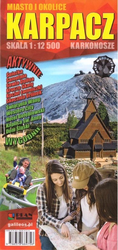 Aktualny plan Karpacza z najbliższą okolicą w bardzo dokładnej skali turystycznej. Mapa idealnie nadaje się dla wszystkich turystów, którzy podczas pobytu w Karpaczu chcą wędrować po najbliższej okolicy miasta z Karkonoszami włącznie. Dodatkowo na mapie zostały zaznaczone najważniejsze atrakcje turystyczne, które zostały podzielone na łatwo dostępne (Wygodnie) i takie, do których trzeba dotrzeć angażując większą ilość sił (Aktywnie). Na rewersie znajduje się opis każdej zaznaczonej atrakcji ze zdjęciem. Na rewersie znajduje się równie schemat szlaków pieszych w okolicy z czasami przejść. Mapa może być ciekawą pamiątką z regionu.