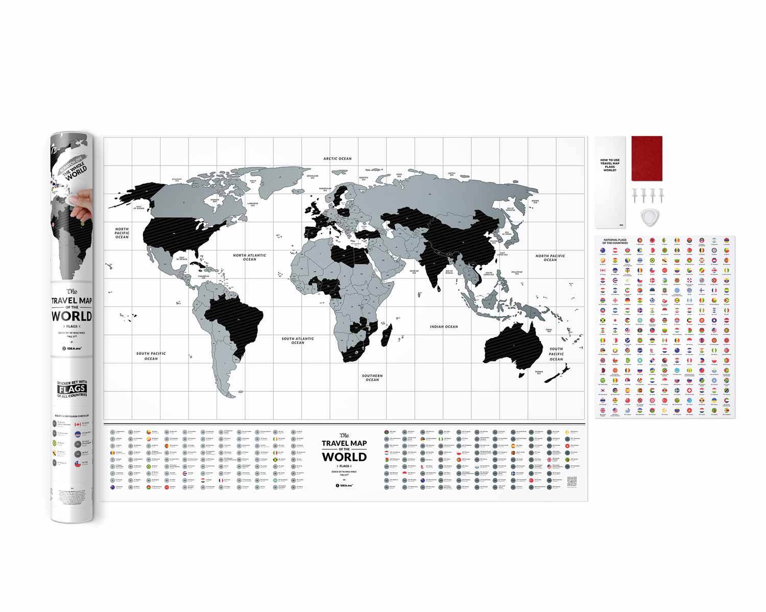 Travel Map™ Flags World to wyjątkowa, biało-czarna mapa świata wraz z listą krajów opatrzoną flagami pokryta srebrną powłoką do zdrapywania. Minimalistyczny design będzie idealnie komponował się z surowymi, nowoczesnymi wnętrzami. To prawdziwy kąsek dla ludzi ceniących minimalizm i wysoką jakość wykonania.