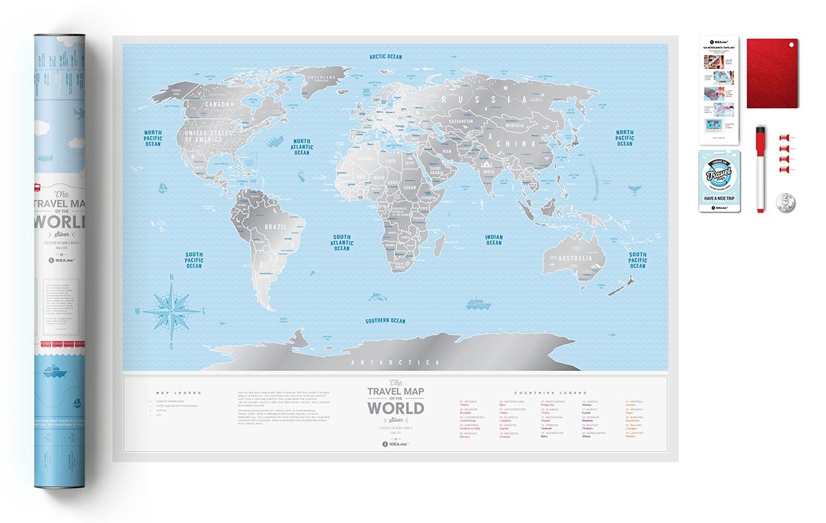 Travel Map(TM) Silver World to minimalistyczna i stylowa mapa świata pokryta srebrną powłoką do zdrapywania.