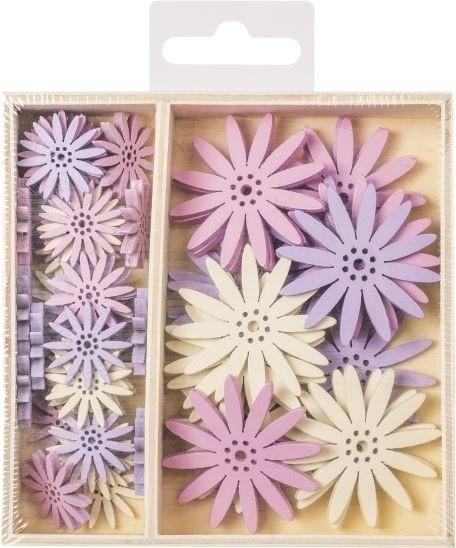 Drewniane pudełeczko z 54 elementami drewnianymi - margaretki w trzech kolorach, w dwóch rozmiarach 2,2 cm i 4 cm.