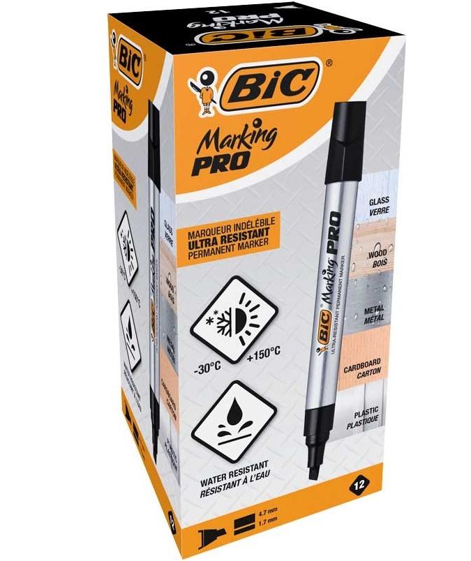 Marker permanentny w kolorze czarnym do stosowania na większości powierzchni: szkło, drewno, metal, karton, plastik.