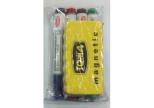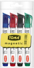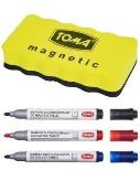 Marker do pisania po tablicach suchościeralnych, łatwościeralny tusz proszkowy na bazie alkoholu, zapach neutralny. Końcówka okrągła 2 mm. Kolory: czarny, niebieski, czerwony, zielony. Ścieracz do białych tablic suchościeralnych z magnesem.
