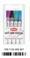 Markery z fibrowa końcówką 2,5 mm, z tuszem permanentnym srebrnym z konturem w innym kolorze - środek linii zawsze srebrny, obwódka w kolorze - do zdobienia wszystkich powierzchni, niezmywalne, unikatowe srebrno - metaliczne cząsteczki zapewnią niesamowite efekty barwne, plastikowa obudowa, zawartość ok. 10 ml tuszu.