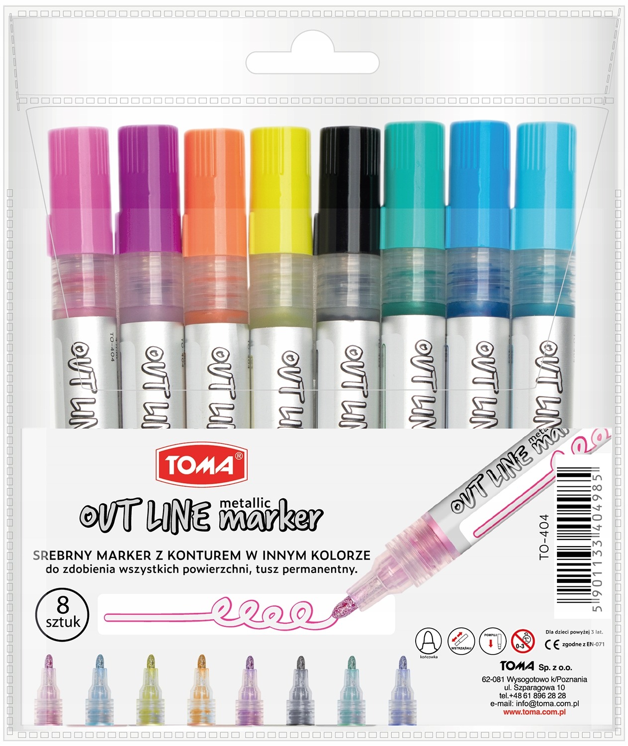 Markery z fibrowa końcówką 2,5 mm, z tuszem permanentnym srebrnym z konturem w innym kolorze - środek linii zawsze srebrny, obwódka w kolorze - do zdobienia wszystkich powierzchni, niezmywalne, unikatowe srebrno - metaliczne cząsteczki zapewnią niesamowite efekty barwne, plastikowa obudowa, zawartość ok. 10 ml tuszu.