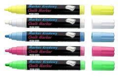 Marker z płynną kredą, do pisania po tablicach czarnych, białych, po szkle i powierzchniach plastikowych. Zmywalny wodą, jak zwykła kreda np. tradycyjną. Nasączalne końcówki fibrowe, bezwonny tusz pigmentowy, nie zawiera xylenu. 20 sztuk w opakowaniu zbiorczym.