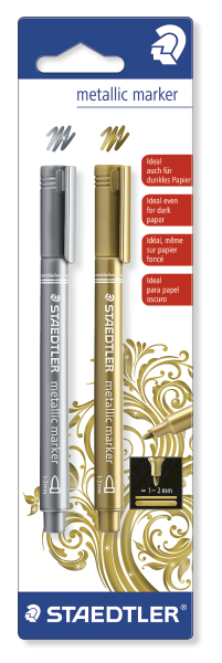 Marker do zdobienia i dekorowania. Do pisania po papierze, kartonie i wyschniętej masie Fimo air. Atrament pigmentowy do bazie wody. Usuwalny z gładkich powierzchni tj. szkło, lustro. Widoczny na jasnym i ciemnym papierze. Idealny do scrapbookingu i dekorowania kart okolicznościowych. Grubość linii pisania 1 2 mm. Okrągła końcówka. Dostępny pojedynczo (kolor złoty i srebrny), w zestawie na blistrze (2 kol: złoty i srebrny oraz 5 kolorów: złoty, srebrny, czerwony, niebieski i zielony)