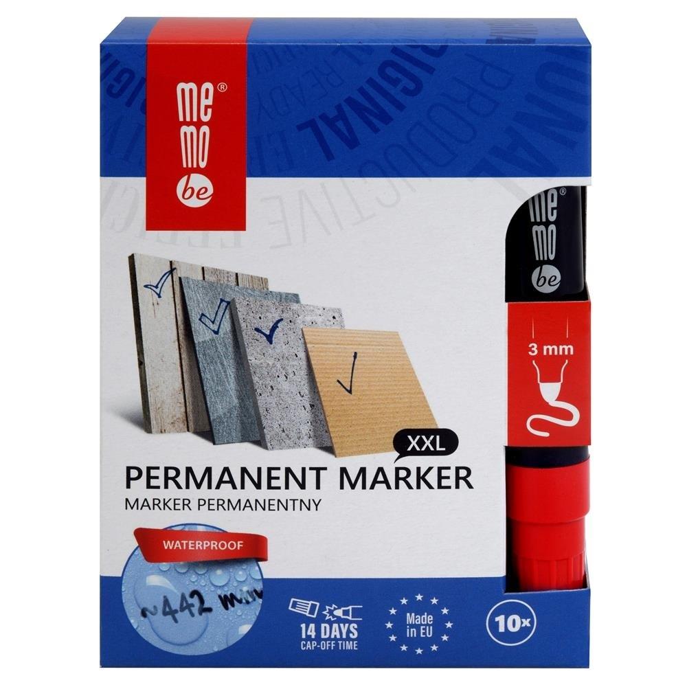 Marker permanentny MemoBe z tuszem w kolorze czerwonym i okrągłą końcówką w rozmiarze 3 mm. Przeznaczony do trwałego znakowania prawie wszystkich powierzchni, jak np.: kartonu, szkła, metalu, plastiku, drewna itd. Wodoodporny i szybkoschnący tusz o słabym zapachu. Może być pozostawiony bez skuwki do 14 dni (ISO 554). Obudowa markera wykonana w 30% z tworzyw z recyklingu. Wyposażony w wentylowaną skuwką zgodną z normą ISO 11540:1993. Dostępny w 4 kolorach: czarnym, zielonym, czerwonym i niebieskim. Wyprodukowany w Europie. Dostarczany w opakowaniu 10 szt.