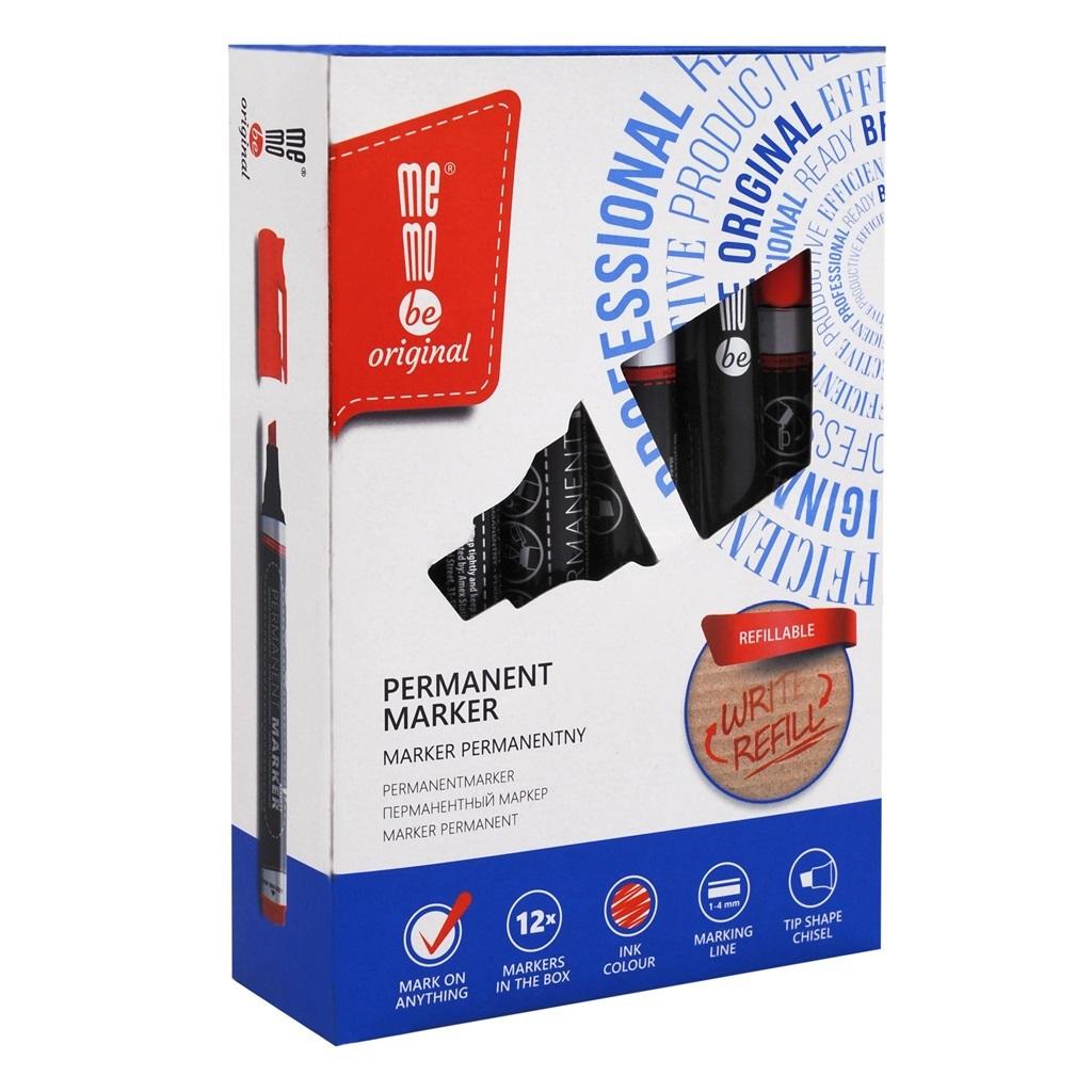 Marker permanentny MemoBe. Doskonały do pisania po gładkich powierzchniach. Trwały tusz na bazie alkoholu odporny na ścieranie. Ścięta końcówka o grubości linii pisania 1-4 mm. Możliwość wymiany tuszu - ekologiczne rozwiązanie. Skuwka ze specjalną końcówką ułatwiającą rozcinanie taśmy, otwieranie kartonów i uzupełnianie tuszu. Czyste i komfortowe ponowne napełnianie. Dostępne 4 kolory: czarny, czerwony, niebieski, zielony.