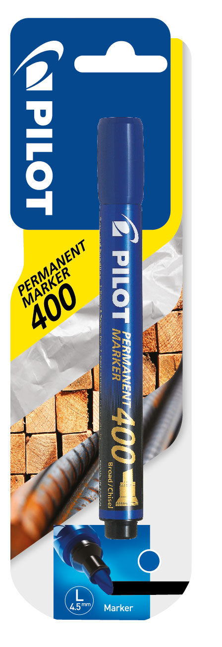 Marker Permanentny SCA-400 w kolorze niebieskim na blistrze. Hit wśród markerów! Wytrzymuje aż 24h bez skuwki! Wytrzymały, wodoodporny tusz w wyraźnych kolorach oraz fibrowa końcówka sprawią, że marker jest idealny dla każdego! Pisze po każdej powierzchni. Występuje w kolorach: czarny, czerwony, niebieski, zielony. Posiada ściętą końcówkę, o grubości pisania maks. 4 mm. Długość linii pisania - min. 500 m