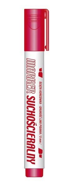 Marker przeznaczony do tablic suchościeralnych. Zawiera wysokiej jakości nietoksyczny tusz na bazie alkoholu, który jest łatwy do starcia z tablicy nawet po kilku dniach. Nie rysuje powierzchni. Bezpieczna skuwka. Odporna na złamania końcówka. Nie zawiera ksylenu i toluenu. Opakowanie: pudełko 12 sztuk. Kolor czerwony.